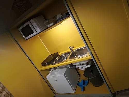 - Kinyitható mini-konyha mikrohullámú sütővel, indukciós főzőlappal, hűtővel, mosogatóval.