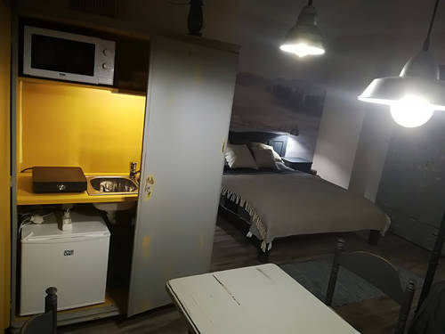 - A fő helyiségben található a nappali és hálószoba rész, valamint a mini-konyha és az étkező rész.